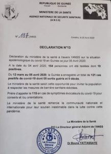 Evolution COVID 19 en Guinée : 1O nouveaux cas positifs pour un total de 121 cas confirmés (ANSS).