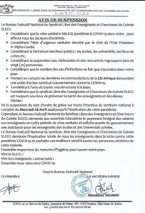 Le Syndicat Libre des Enseignants et Chercheurs de Guinée (SLECG), suspend sa grève qui paralyse par endroit l’école guinéenne, à compter du mercredi 08 Avril, jusqu’à la fin de l’épidémie en Guinée. C’est une décision du bureau exécutif du SLECG tout en invitant les enseignants à s’impliquer dans le cadre de la lutte contre le coronavirus qui se propage en Guinée, déjà 194 cas confirmés selon l’agence nationale de sécurité sanitaire.
