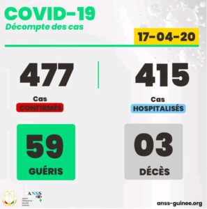 Le rythme de la propagation du coronavirus en Guinée, devient inquiétant. Selon l’ANSS, 39 nouveaux cas positifs viennent d’être enregistrés, ce qui porte à 447 cas confirmés malades, 415 hospitalisés, 59 guéris et 3 décès.