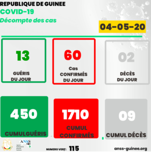 60 nouveaux cas positifs au covid 19, ont été enregistrés à la date 03 mai, suite à des tests effectués sur un échantillon de 225 personnes, selon l’ANSS. Ce qui porte à 1710 cas confirmés, dont 450 guéris et 9 cas de décès hospitaliers.