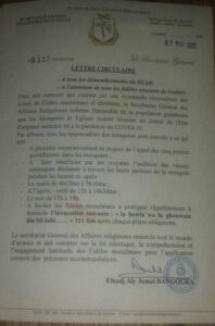 Depuis quelques jours, une rumeur faisant état de la réouverture des lieux de culte circulait à Conakry. Pour couper court aux rumeurs, le secrétariat général aux affaires religieuses, dément la rumeur et annonce que les lieux de cultes restent fermés jusqu’à nouvel ordre.