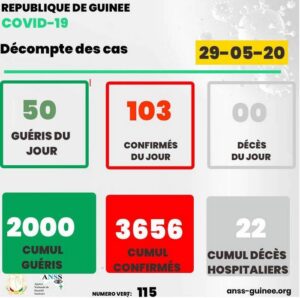 Selon les chiffres publiés par l’ANSS ce vendredi 29 mai, 103 nouveaux cas ont été enregistrés suite à des tests effectués sur 702 personnes. Le compteur affiche, 3656 cas confirmés de coronavirus dont 2000 guéris et 22 décès hospitaliers.