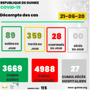 A date, la Guinée compte 4988 cas confirmés de coronavirus dont 3669 guéris et 27 décès hospitaliers.