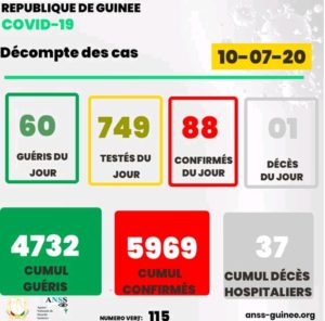 La Guinée affiche désormais, 5969 cas positifs au covid-19, dont 4732 guéris et 37 décès hospitaliers.