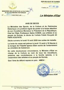 Dans un communiqué qu’il vient de rendre public, le ministère de la culture, informe l’ensemble des acteurs culturels que l’artiste Papa Kouyaté, décédé le 10 Août des suites de maladies à Conakry, sera inhumé ce jeudi 13 Août au cimetière de Cameroun après la levée du corps à la morgue de l’hôpital Ignace Deen.
