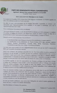 Le PADES, le parti dirigé par Dr Ousmane Kaba, a dans une déclaration ce mercredi 28 octobre, dénoncé les fraudes massives qui ont caractérisées le scrutin. Le parti déplore les violences entrainant des morts, des blessés et destruction de biens publics et privés.