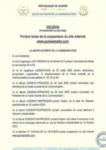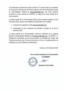 Bonne nouvelle pour le monde des médias en ligne. La Haute Autorité de la Communication (HAC), vient de lever la suspension qui pesait sur le site guinéematin pour avoir relayer les résultats de la présidentielle en live sur son site.