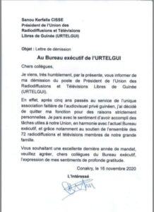 Sanou Kerfalla Cissé a démissionné à la tête de l’Urtelgui (Union des radiodiffusions et télévisions libres de Guinée), 5 ans après avoir été porté à la présidence de cette association de medias guinéens.