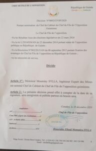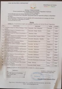 Elhadj Mamadou Sylla, le chef de file de l’opposition vient de meubler son cabinet composé d’une quinzaine de membres. Le cabinet est composé de figures connues notamment Fodé Mohamed Soumah, le president de la GeCi qui est porte-parole, Mamadou Baadiko Bah de l’UFD, Siaka Barry du MPDG etc…La mise en place du cabinet intervient quelques jours après la reconnaissance du statut de chef de file de l’opposition à Elhadj Mamadou Sylla par l’assemblée nationale.