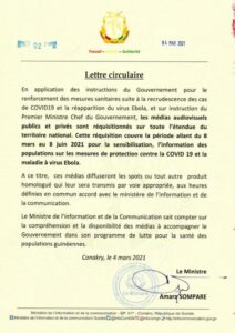 Face à la pandémie du covid-19 et la résurgence de la maladie Ebola, le ministre de la communication Amara Somparé, à dans une circulaire en date du 4 mars, annoncé la réquisition des médias audiovisuels publics et privés en Guinée afin d’accompagner les efforts des autorités par des sensibilisations et la diffusion de spots pour la lutte contre le covid et Ebola.