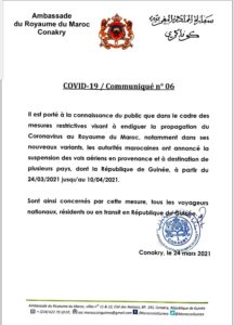 Dans un communiqué publié ce mercredi 24 mars, l’ambassade du Maroc en Guinée, annonce que pour des raisons liées à la lutte contre le covid-19 notamment dans ses nouveaux variants, les vols en provenance et à destination de la Guinée sont suspendus jusqu’à nouvel ordre. Cette interdiction vise aussi plusieurs autres pays notamment, le Ghana, la République Démocratique du Congo, le Mali, la Libye etc…