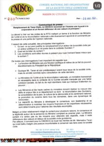 Dans un communiqué publié ce samedi 1er mai, le Conseil national des orgnaisations de la société civile guinéenne (CNOSCG), exprime sa reconnaissance à l’endroit du ministre Taran Diallo, qui n’a pas été reconduit à la tête du ministère de l’Unité nationale et de la citoyenneté. Par ailleurs tout en saluant son engagement au sein de la société civile, le CNOSCG déplore le manque de moyens et de cadres qui minent le fonctionnement du département de l’unité nationale.