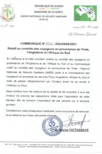 L’Agence nationale de sécurité sanitaire, s’active pour prévenir la présence des variants mortels du covid-19 en Guinée. Ces nouvelles souches sont notamment identifiées en Inde, en Angleterre et en Afrique du Sud. Dans un communiqué, l’ANSS invite les voyageurs en provenance de ces (3) pays de passer par la capitale avant de se rendre à l’intérieur du pays.