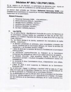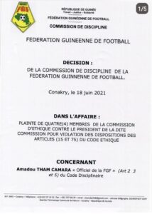 La crise qui mine la fédération guinéenne de football, est loin de connaitre son épilogue. En plus du report du congres électif pour élire le successeur d’Antonio Souaré, les différentes commissions se livrent une guerre sans merci. Dernier cas en date, la commission de discipline annonce ce vendredi 18 juin, dans une lettre dont copie est parvenue à la rédaction de Convergencegn.com, la suspension d’Amadou Tham Camara, de sa fonction de président de la commission d’éthique de la Féguifoot. Motif invoqué, la violation par Adama Tham Camara, des statuts et textes régissant le fonctionnement de la Féguifoot. Ce n’est pas tout, Amadou Tham Camara est interdit d’exercer toutes activités liées au football et de payer une amende de 5 millions de francs guinéens.