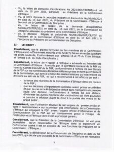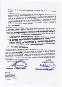 Ci-dessous la copie de la lettre de suspension de la commission de discipline :