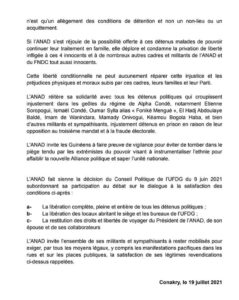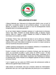 Les membres déplorent l’arrestation arbitraire le 14 juillet dernier de Monsieur Thierno Yaya Diallo, Président de Guinée Moderne (GM), et Monsieur Bogola Kéamou Haba ancien Président de l’UGDD et Président de la Commission communication de l’ANAD.