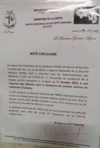 Dans un communiqué qu’elle vient de publier, l’Agence nationale de sécurité sanitaire (ANSS), envisage de réduire les centres de traitement CT-EPI de Conakry. L’ANSS motive sa décision par le fait de la diminution considérable du taux de contamination et de décès liés à la covid-19.