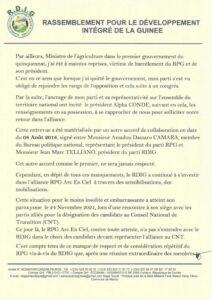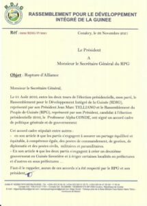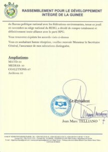 Dans une lettre en date du 26 novembre 2021, Jean Marc Telliano, justifie la décision de son parti de quitter le navire jaune, par le non-respect des contenus des différents accords signés avec l’ancien régime.