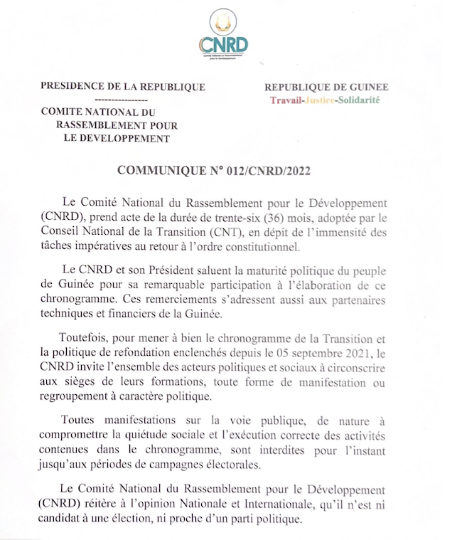 La logique de menace et de méfiance prend le dessus sur celle du dialogue et du compris entre le CNRD et la classe politique. Et pour cause, alors que le CNT a adopté une résolution fixant la durée de la transition à 3 ans, une durée contestée par des acteurs politiques réunis au sein du G58, la junte militaire au pouvoir prend acte dudit delai et interdit les manifestations de rue jusqu’aux périodes de campagnes électorales.