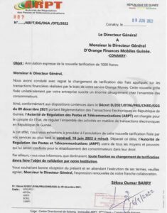 Selon l’ARPT, la nouvelle tarification a été unilatéralement décidée par Orange Guinée et cause d’énormes désagréments chez les consommateurs. Les responsables d’Orange Guinée ont jusqu’à ce vendredi 10 juin 2022, à minuit pour se plier à la décision.