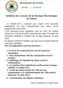 Les acteurs intervenants dans les transactions Orange Money, réunis au sein du syndicat des acteurs de la monnaie électronique de Guinée (SAMEL-GUI), ne sont pas contents des nouvelles diminutions sur leurs commissions dû à la nouvelle politique de tarification à 1000 francs que l’opérateur Orange Guinée avait décidée avant d’être annulée par l’ARPT.