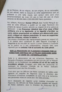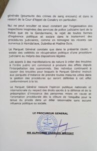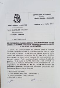 Au lendemain de l’arrestation musclée des responsables du FNDC, notamment Foniké Mangué, l’artiste Djani Alpha et Billo Bah, Charles Wright, le procureur général près la cour d’appel de Conakry, s’est fendu d’un communiqué de 7 pages pour apporter des précisions sur les incidents et les charges retenues à l’encontre des leaders du FNDC.