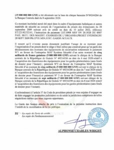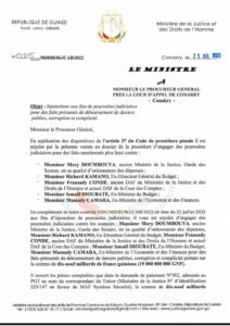 Dans un courrier en date du 25 juillet 2022, Charles Wright, le ministre de la justice, ordonne au procureur général de la Cour d’appel de Conakry, de poursuivre pour des faits présumés de détournement de deniers publics, corruption et complicité portant sur la somme de dix-neuf milliards de francs guinéens (19 000 000 000 GNF), les ministres cités plus haut.