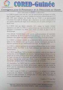 Dans une déclaration publiée ce lundi 15 août 2022, la CORED, une coalition politique dirigée par El hadj Mamadou Sylla, apporte son soutien au FNDC qui projette d’organiser ce mercredi 17 août 2022 pour exiger le retour à l’ordre constitutionnel et dénoncer la conduite de la transition par la junte militaire.