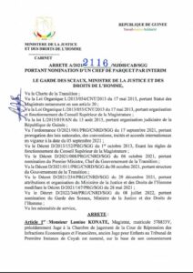 Dans un arrêté pris ce jeudi 25 août 2022, Charles Wright, le ministre de la justice remplace Mohamed Diawara à la tête du Parquet spécial du tribunal pour enfants. Il est remplacé par le magistrat Lamine KONATE « matricule 578853V ». Ce dernier était jusque-là, juge à la Chambre de jugement de la Cour de Répression des Infractions Economiques et Financières.
