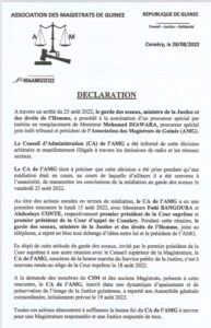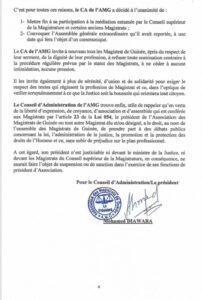 En dépit des médiations encours impliquant le président de la Cour suprême, l’association des magistrats de Guinée regrette que Charles Wright ne soit pas réceptif. C’est pourquoi, au regard de l’enlisement de la situation, l’AMG décide de se retirer de la médiation et convoque une Assemblée Générale des magistrats dont la date fera l’objet d’un communiqué :