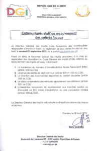 Dans un communiqué en date du mardi 30 août 2022, la direction générale des impôts, invite l’ensemble des contribuables reliquataires d’impôts et taxes, au règlement de leurs dettes fiscales au plus tard le 23 septembre 2022. Faute de quoi, la direction générale des impôts, va procéder à des sanctions notamment le retrait de l’immatriculation fiscale permanent et bien d’autres mesures.
