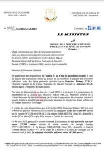 Des ennuis judiciaires pour Bakary Sylla, l’actuel directeur général de la caisse nationale de sécurité sociale. En effet, charales Wright le ministre de la justice instruit le procureur général près la cour d’appel de Conakry d’engager des poursuites judiciaires pour des faits présumés de détournement de deniers publics et de complicité contre Bakary SYLLA, et Assimiou SALL, ancien Agent Comptable de ladite caisse.