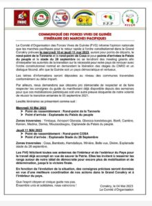 Dans un communiqué publié ce jeudi 4 mai 2023, les forces vives ont dévoilé l’itinéraire des marches avec pour point de ralliement les ronds-points de la tannerie et de Cosa pour les points d’arrivées le palais du peuple et le stade du 28 septembre.