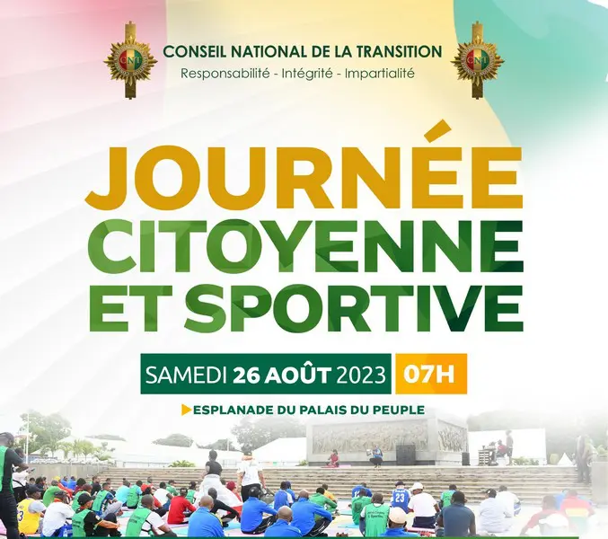 Après le succès éclatant des premières séances, le Conseil National de la Transition organise ce samedi 26 août 2023, la Journée Citoyenne et Sportive. L’événement se déroulera sur l’esplanade du palais du peuple à partir de 8h (communiqué).