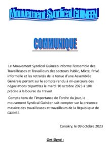 En attendant, dans un communiqué publié dans la soirée de ce lundi 9 octobre 2023, le mouvement syndical convie la classe ouvrière à une importante assemblée générale ce mardi 10 octobre 2023, à la bourse du travail à 10heures.L’objectif de la dite assemblée, est de faire une restitution à mi-parcours des négociations tripartites.