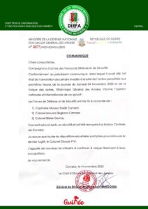 Dans un deuxième (2) communiqué publié ce samedi 4 novembre 2023, le Chef d’Etat-major général des armées confirme le retour en prison du Capitaine Dadis Camara, Colonel Moussa Tiègboro et Blaise Gomou, tous saints et saufs et en sécurité.