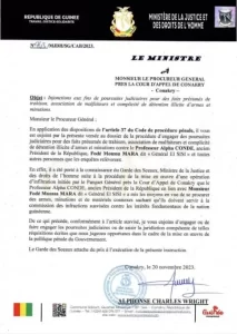 En effet, Charles Wright, le ministre de la justice instruit le procureur Général près la Cour d’appel de Conakry, d’engager des poursuites judiciaires contre l’ex président Alpha Condé pour les faits suivants : « trahison, d’association de malfaiteurs et complicité de détention illicite d’armes et minutions ». C’est du moins le contenu d’un communiqué signé par le garde des sceaux et publié ce lundi 20 novembre 2023.