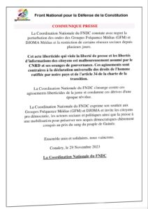 Ci-dessous la copie du communiqué du FNDC :