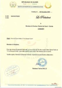 Dans un courrier en date du 6 décembre 2023, Boubacar Yacine Diallo, le président de la HAC invite le Directeur Général de canal+ Guinée de procéder au retrait de Djoma TV de son bouquet pour des raisons de “sécurité nationale ”.