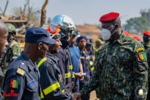 Sur place, le Colonel Mamadi Doumbouya a salué le courage et le travail abattu par les sapeurs-pompiers, toute chose qui a permit de contenir les flammes donc le brasier.
