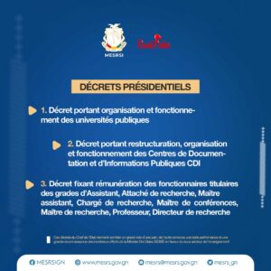 Concernant l’organisation et le fonctionnement des institutions d’enseignement supérieur, le décret du Chef de l’Etat, le Général de corps d’armée, Mamadi Doumbouya, mentionne que des nouvelles universités peuvent être créées conformément aux dispositions de la loi portant statuts particuliers des Institutions d’enseignement supérieur, de recherche scientifique, des centres de documentation et d’information.