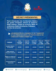 Par ailleurs, le décret du Chef de l’Etat fixe également les indemnités de logement, les primes de grade, de préparation et de craie des fonctionnaires notamment les catégories d’assistant, attaché de recherche, maître assistant, chargé de recherche, maître de conférence, maître de recherche, professeur, et directeur de recherche comme indiqué dans le tableau ci-dessous :