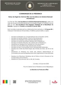 C’est un communiqué de la présidence qui l’annonce. Après une visite de deux jours au Rwanda à l’invitation de son homologue Paul Kagamé, le président de la transition guinéenne, le Général de corps d’armée, Mamadi Doumbouya regagne Conakry ce samedi 27 janvier 2024, à 15h peut-on lire dans le communiqué de la présidence, qui évoque une visite de travail et d’amitié pleinement accomplie par le Chef de l’Etat.