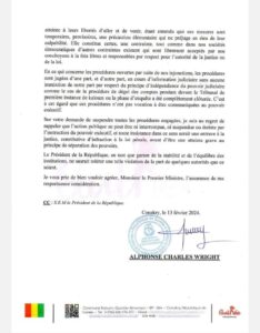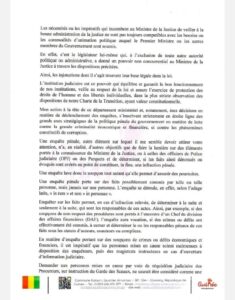 Par conséquent, Charles Wright, indique au premier ministre: « qu’il est au regret de rappeler que l’action publique ne peut ni être interrompue, ni suspendue ou éteinte par l’instruction du pouvoir exécutif, et toute entrave dans ce sens serait une entrave à la justice, consécutive à d’infraction à la loi pénale, avant d’être une atteinte grave ua principe de séparation des pouvoirs », a écrit Charles Wright.