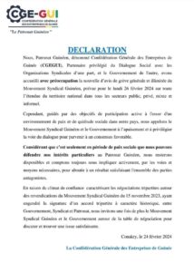 « Guidés par des objectifs de participation active à l’essor d’un environnement de paix et de quiétude sociale dans notre pays, nous appelons le mouvement syndical guinéen et le gouvernement à l’apaisement et à privilégier la voie du dialogue pour parvenir à un consensus favorable », c’est en substance l’appel de la Confédération générale des entreprises de Guinée au gouvernement et aux syndicats pour parvenir à un compris et éviter la grève générale et illimitée prévue ce lundi 26 février 2024.