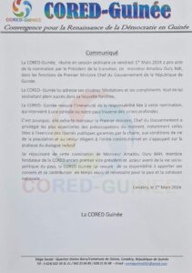 Dans une déclaration rendue publique ce vendredi 1 mars 2024, la Coalition convergence pour la renaissance de la démocratie en Guinée ( CORED-Guinée), prend acte de la nomination de Bah Oury, premier ministre chef du gouvernement.