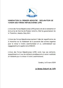 Dans une déclaration publiée ce vendredi 1 mars 2024, l’Union des Forces Démocratiques, prend acte de la nomination de Bah Oury et l’invite à la poursuite des actions urgentes pour le retour à l’ordre constitutionnel et ce, conformément aux engagements pris auprès de la CEDEAO.