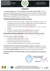 La Direction Générale de la Caisse Nationale de Sécurité Sociale (CNSS), à travers un communiqué publié ce jeudi 28 mars 2024, porte à la connaissance des pensionnés que le versement des pensions de retraite de l’échéance d’avril 2024 débutera le mercredi 03 avril 2024 à 8 heures 00 sur toute l’étendue du territoire national.