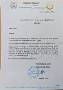 Dans une correspondance publiée ce jeudi 28 mars 2024, la HAC invite le journaliste Babila Keïta à se présenter le mecredi 3 Avril 2024, à 11h au siège de l’institution pour une rencontre d’échanges avec le collège des commissaires.