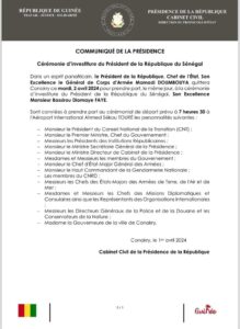 Dans un communiqué, la présidence de la République annonce que le cérémonial de départ du Chef de l’Etat est prévu ce mardi 2 avril 2024, à 7h à l’aéroport international Ahmed Sékou Touré.